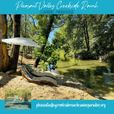 Beautifully set within five fenced acres. Tucked away and surrounded by a peaceful year round running creek, several mature oak trees and covered decks providing plenty of shade and toys for you and your pup to have a fun adventure together without the distraction of other animals or people. Bring your pups for a private tranquil experience!